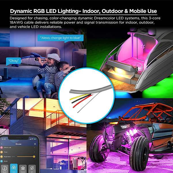 • Applications: Wiring of control cable, dynamic LED Wire, Vehicle Light Cord, Indoor Lighting Cable, Signal System, Power Extension Cord, etc….. for home, car or boat marine environment and other low-voltage applications.