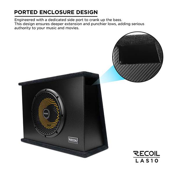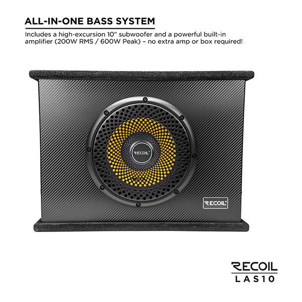 Includes a high-excursion 10" subwoofer and a powerful built-in amplifier (200W RMS / 600W Peak) – no extra amp or box required!